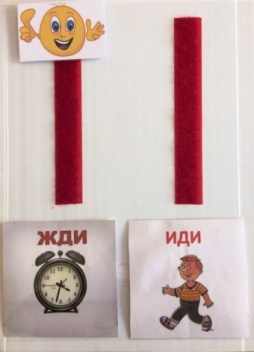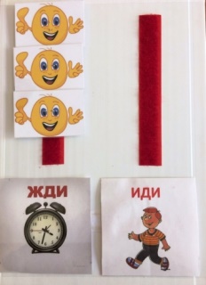 Так же на этом планшете размещены два визуальных указателя для ребёнка «ЖДИ» и «ИДИ», оформлены они в виде картинок, которые учитель дефектолог использует для регулировки поведенческих реакций ребёнка. В ходе коррекционного занятия с ребёнком с РАС нередко возникают вспышки негативных реакций на действие или просьбу специалиста, тогда на помощь приходит планшет с табличкой «ЖДИ», что способствует устранению негативной реакции на занятии, выработки навыка контролировать свое поведение в целом.