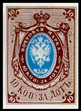 Официальное всеобщее использование марок на территории России началось 13 января 1858 года. Первая почтовая марка появилась 10 декабря 1857 г. Это была беззубцовая марка достоинством «10 копеек за лот».