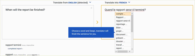 DeepL Translator — это действительно классный инструмент с его определениями и опциями автоматического завершения предложения. Вы можете выбрать из семь языков и когда вы получите перевод, просто дважды щелкните слово для получения более подробной информации.