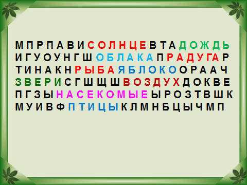 б) Красивый цветок. У него широкие продолговатые листья, на которых видны прожилки. В листьях прячутся тоненькие стебельки с цветочками нежно-белого цвета, напоминающие бубенчики, у них нежный запах. Когда отцветают, вместо цветов появляются маленькие красные горошины. Свежие цветы настаивают и получают капли. Из стебельков добывают эфирные масла. Живёт 21 год, а цветёт всего 2-3 раза. Беленький горошек На зелёной ножке. ( Ландыш. В медицине используют при заболеваниях сердца. Очень ядовитый. У человека при отравлении им появляются тошнота, рвота, судороги.) Самостоятельная работа и самопроверка. Подсчитывается количество найденных слов.