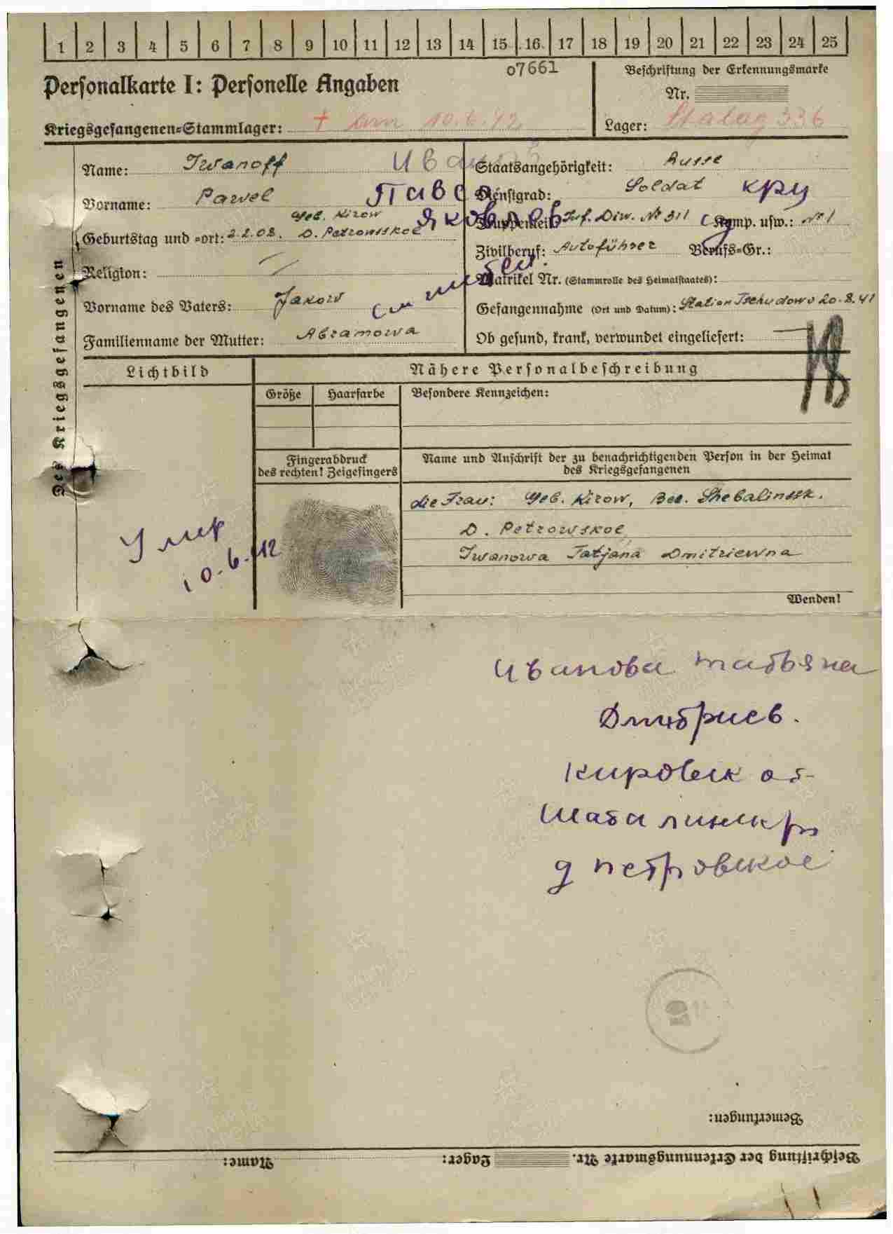 Немцы скрывали следы своих преступлений, сначала было невозможно узнать, где, как и когда погиб солдат. Долгое время было неизвестно, как и когда погиб и мой прадед. Уже после войны его жена получила письмо из Архангельска от его друга, с которым они вместе находились в концлагере. Он и сообщил, что Павел умер от тифа в июне 1942 года. Точное место захоронения установить так и не удалось, так как немцы обычно сжигали болевших тифом. Но сейчас нам удалось узнать, где и когда погиб мой прадед.