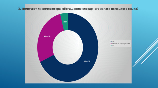 Цель исследования : выявить способы изучения немецкого языка с помощью компьютера и Интернета.