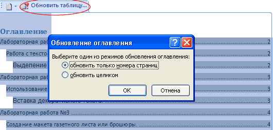 Выделите созданное вами Оглавление, Нажмите Обновить таблицу и выберите Обновить только номера страниц