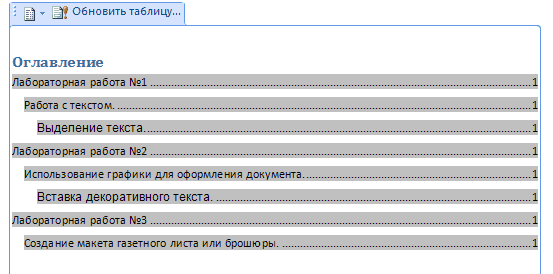 Примечание: так как оглавление создается там, где находится курсор, проследите, чтобы курсор находился вверху страницы, перед текстом.
