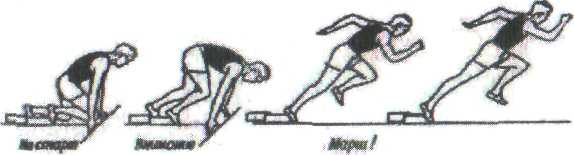 равновесие и создаст условие для начала бега. Тяжесть тела переносится на руки и толчковую ногу. Маховая нога не испытывает большой нагрузки тяжести тела. 'Газ поднимается несколько выше плеч, линия спины направлена вперед вниз к плечам.