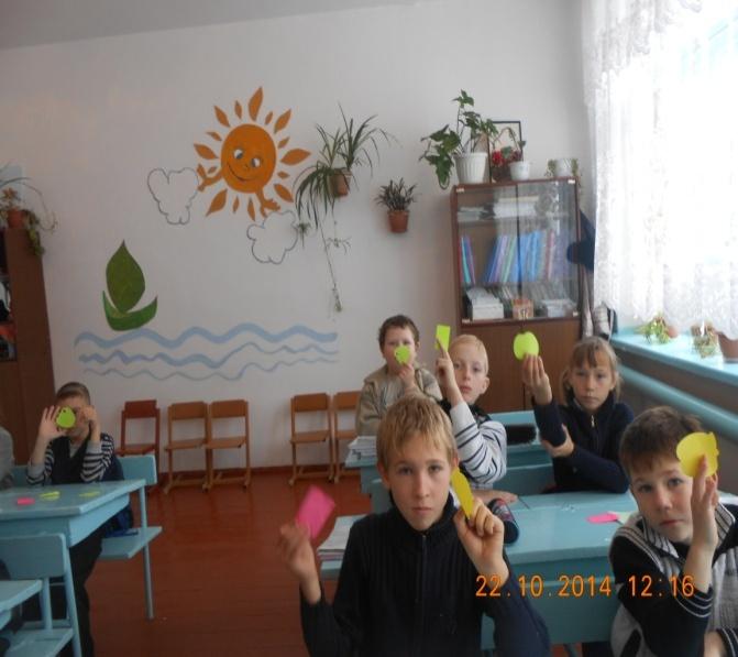 – А теперь оцените свою работу. Поднимите соответствующий квадрат.