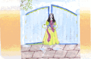 (... За воротами стояла принцесса. Но, боже, в каком она была виде! Потоки дождевой воды стекали по ее волосам и платью на носки туфель и вытекали из–под каблуков.)