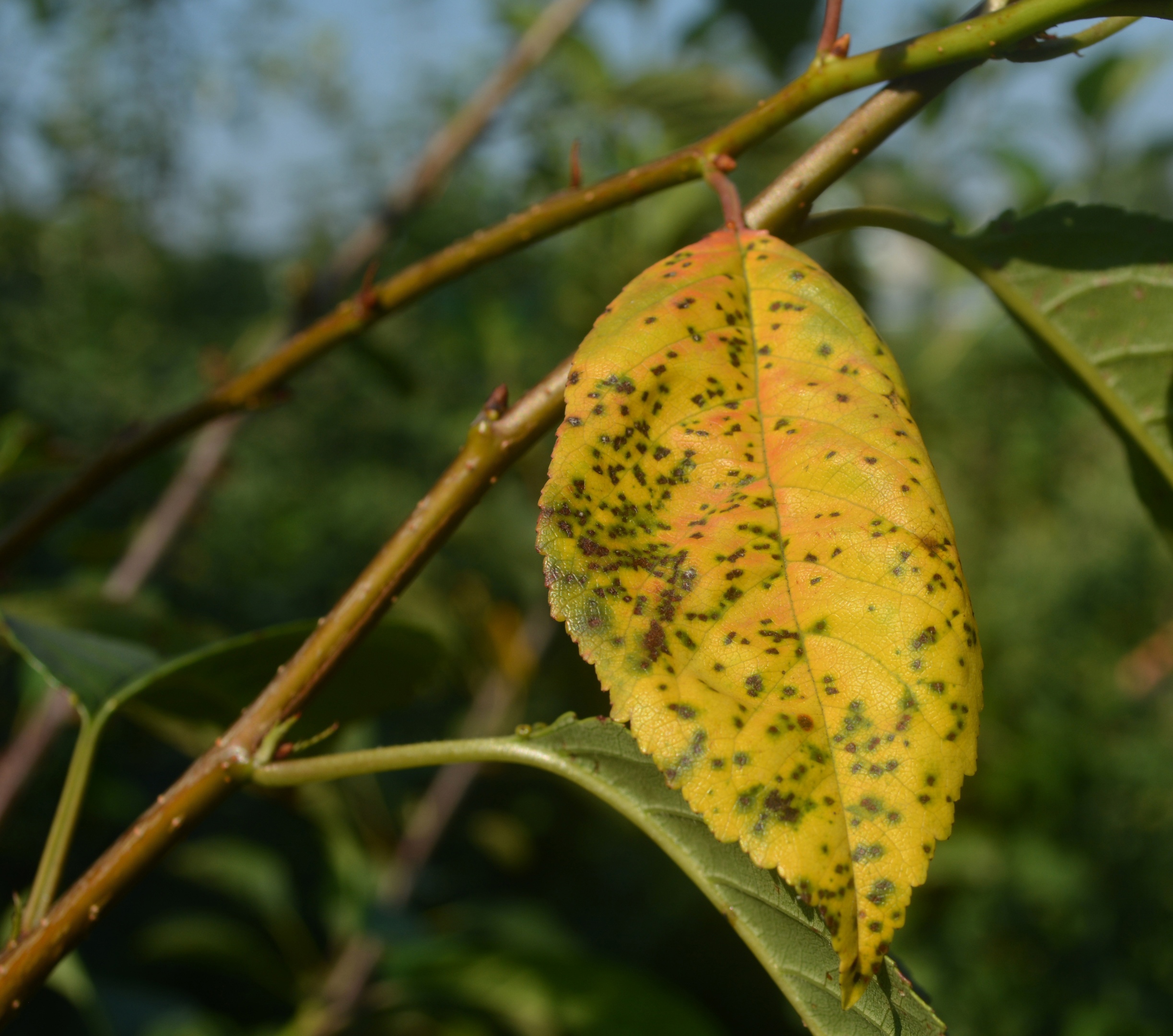 Рис. 3 Пораженный коккомикозом лист сорта Владимирская |