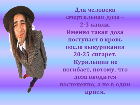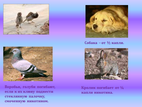 -Знаете ли вы, что воробьи и голуби погибают, если к их клюву поднести палочку, смоченную никотином? Кролик погибает от ¼ капли никотина, собака от1 /4. Для человека смертельная доза составляет 2-3 капли. Слайды 13,14