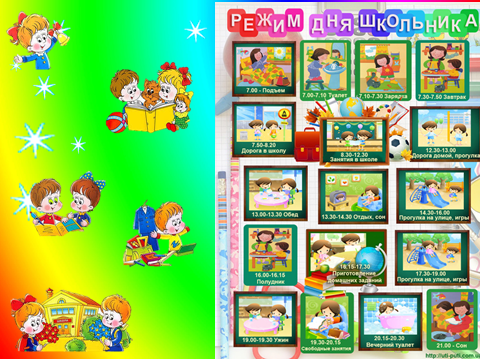 Знаю! Подъем. Зарядка. Умывание. Уборка постели. Завтрак. Прогулка. Приготовление уроков. Прогулка. Обед - и в школу.